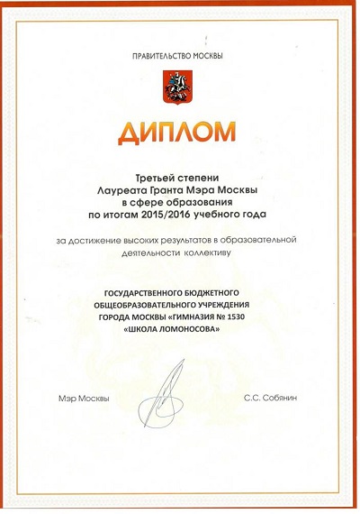 По итогам 2015-2016 учебного года за достижение высоких результатов в образовательный деятельности наша гимназия получила диплом третьей степени Лауреата Гранта Мэра Москвы в сфере образования . Также гимназия вошла в "Топ-300" лучших школ Москвы, заняв 109 место.