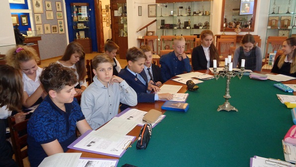 Руководитель музея Людмила Анатольевна Тимофеева обратила внимание учащихся на музейную коллекцию, в которой находится прижизненное издание этого сочинения, предоставила возможность рассмотреть факсимильное издание «Российской грамматики», точно воспроизводящее все особенности учебника XVIII века.
