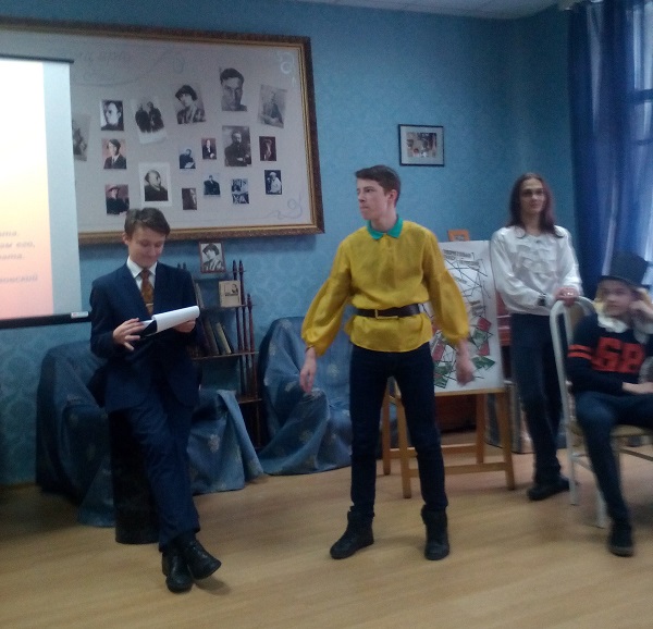 24 января в Пушкинском доме в «Литературном салоне» музея Серебряного века состоялась незабываемая встреча учеников 6 класса с яркими представителями футуризма в России начала XX века: В. Маяковским, В. Каменским, А. Крученых, В. Хлебниковым, И. Северяниным. Это была вторая часть интерактивного урока истории в 9 классе «Культура России в начале XX века. Духовная жизнь Серебряного века». Урок подготовили учитель истории Миронов И.В. и заведующая музеем Серебряного века Шебаан Л.А.